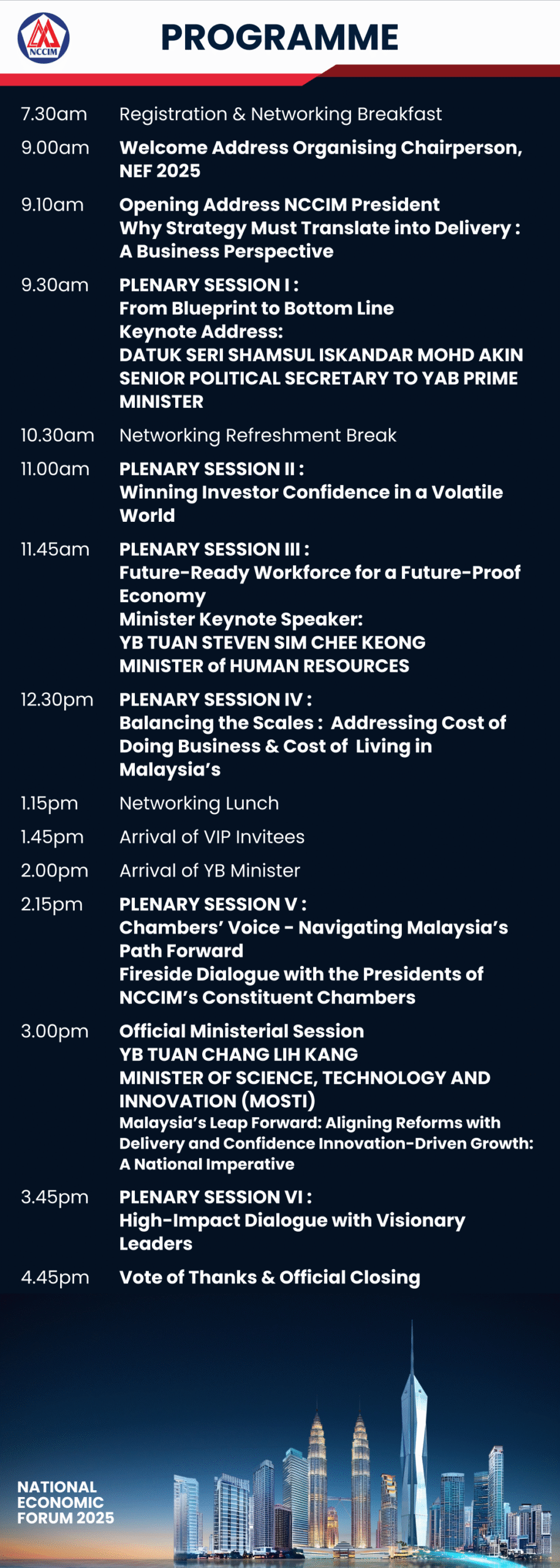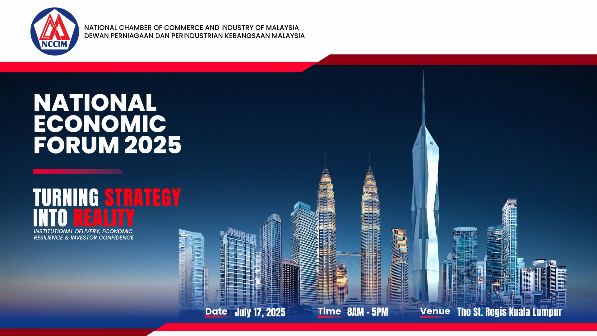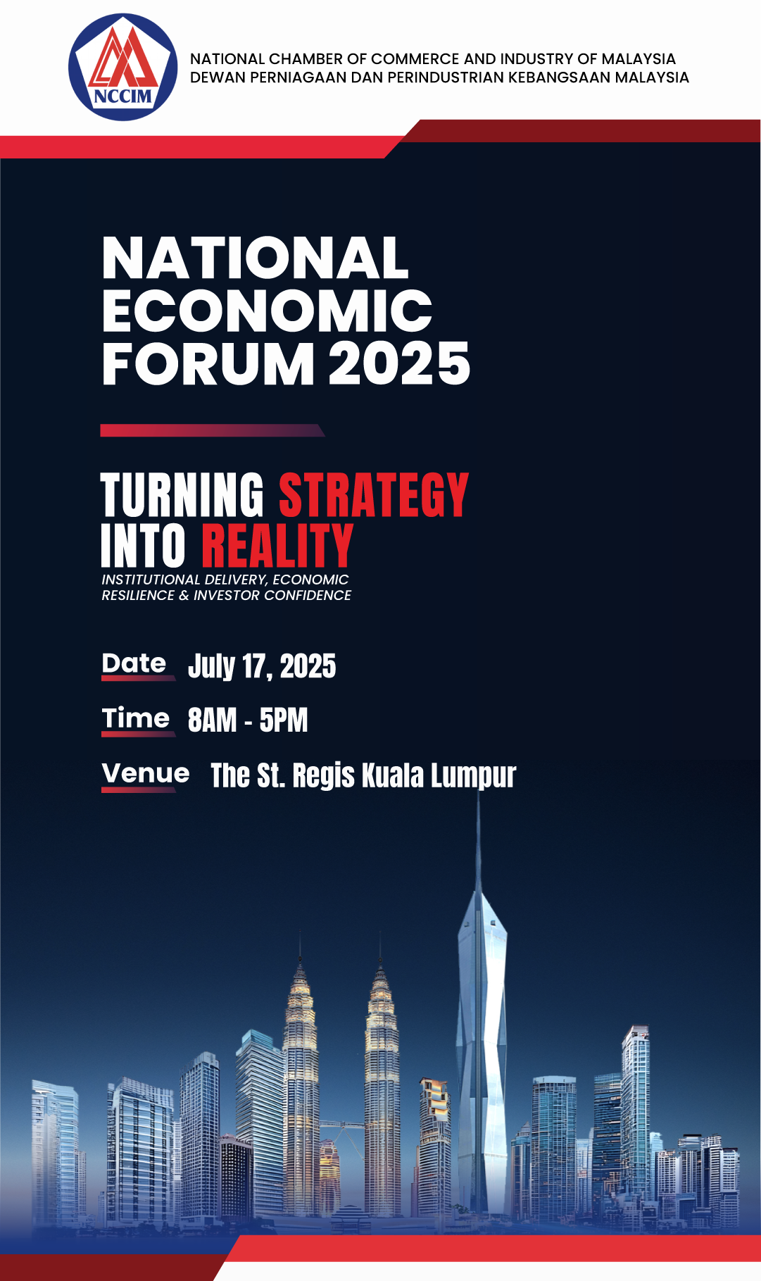 The National Economic Forum (NEF) is a yearly event organised by National Chamber of Commerce & Industry of Malaysia. NEF 2025 aims to serve as a platform for robust dialogues and collaborative solutions to address the evolving challenges facing Malaysia amidst global economic realignment, technological disruption, and sustainable growth. The forum will focus on positioning Malaysia strategically for the next phase of growth by cultivating a forward-thinking economic ecosystem driven by investment, innovation, and inclusivity.